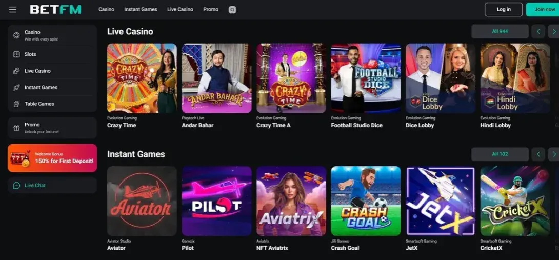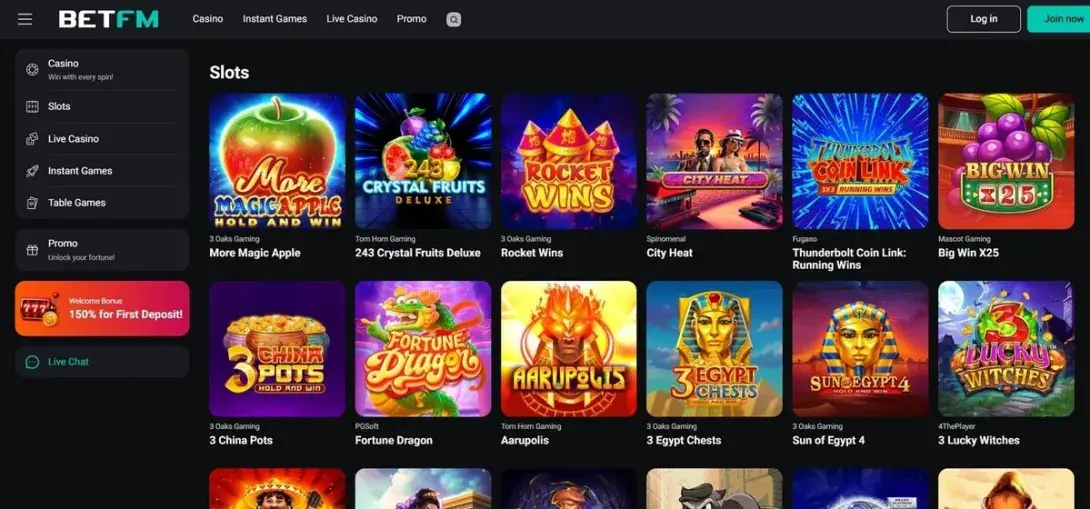 Over 1,000 slots and table games, including poker variants, power the BetFM online casino.